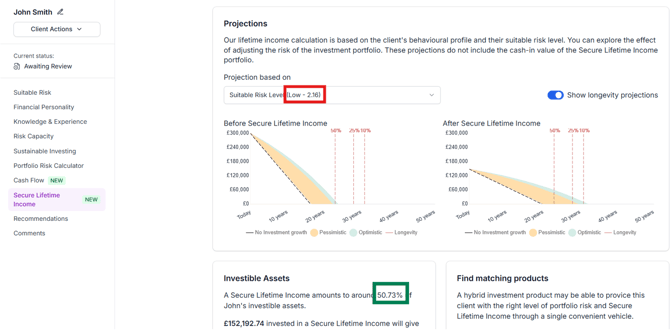 The suitable risk level and SLI % can be found on the Guaranteed Income page in the client profile as shown below. If you want to invest at a different risk level, or are allocating a different percentage of the client’s investible assets towards SLI, you should use these numbers instead.