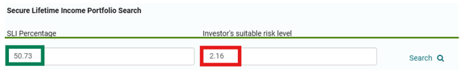 We have created a fund search that you can use to find suitable Guaranteed Income (GI) generating portfolios for your clients. To use this tool, you will need to know the Suitable Risk Level for the customer’s investment portfolio and the percentage of the portfolio that will be allocated to SLI. These metrics are easy to find if you have used the Guaranteed Income feature in Investor Compass.